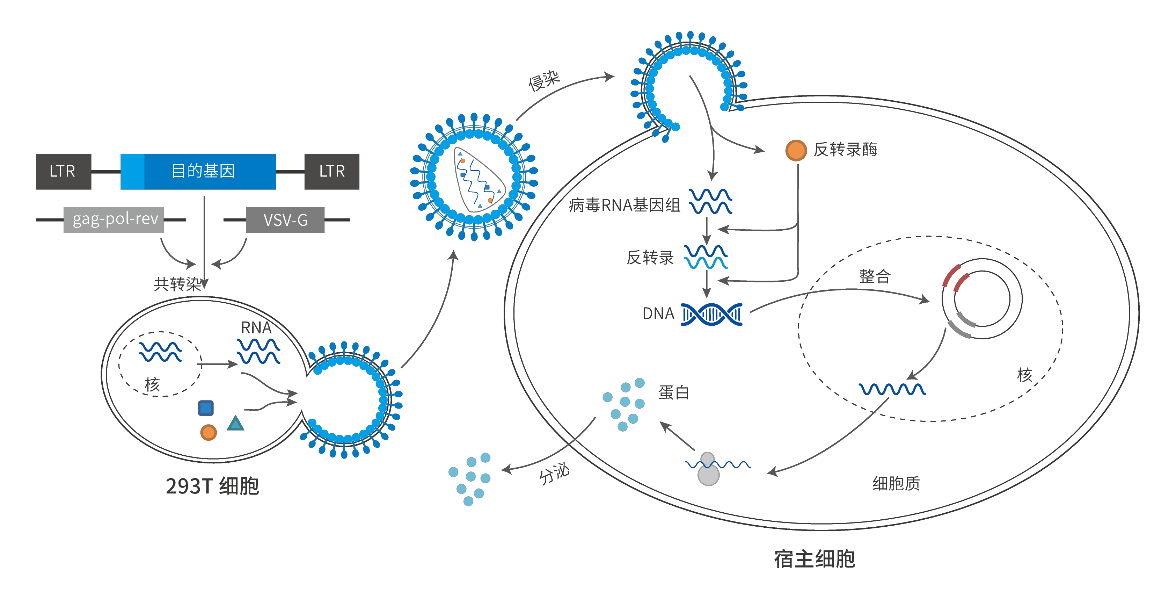 图1 慢病毒包装和侵染细胞的过程