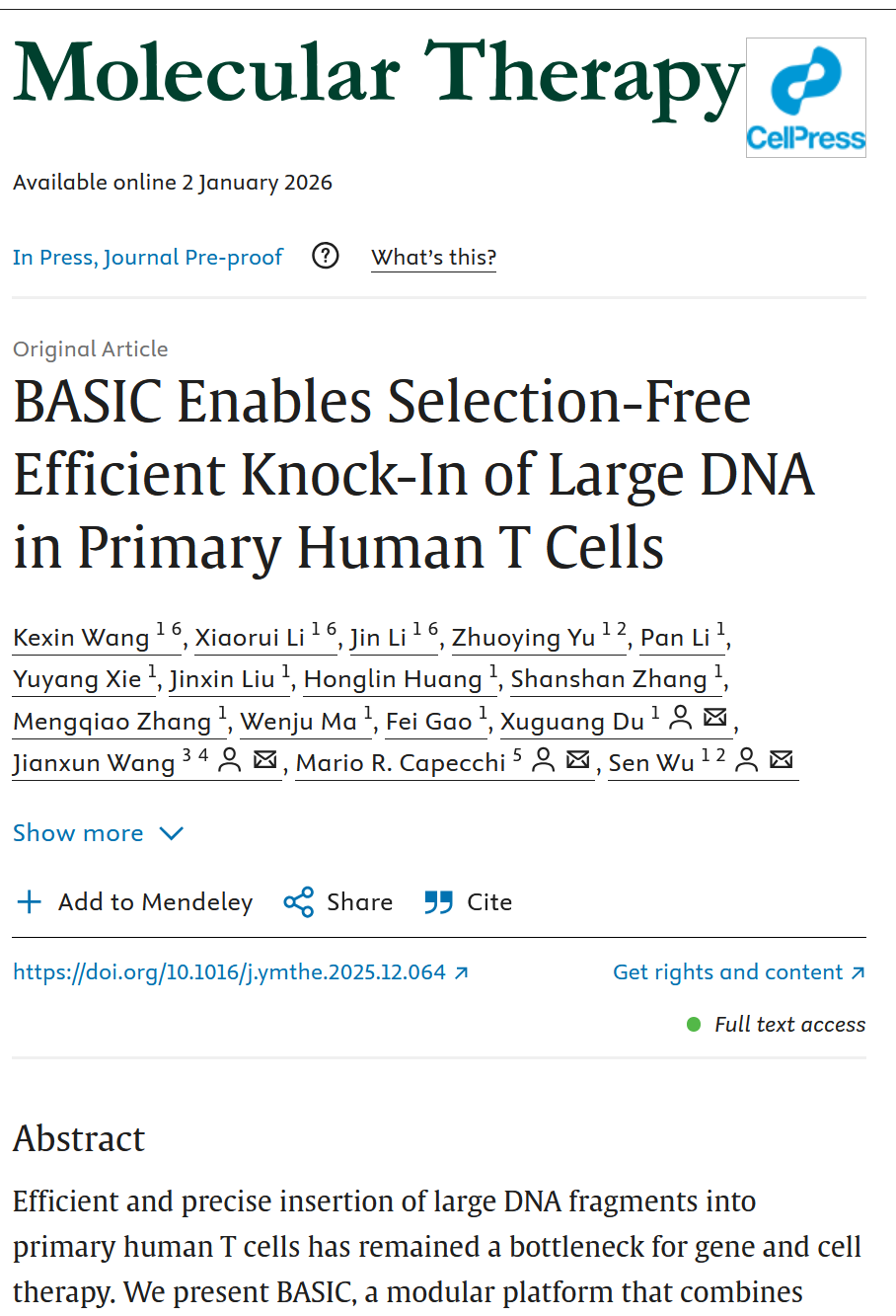 Recently,an important research achievement, entitled 《BASIC Enables Selection-Free Efficient Knock-In of Large DNA in Primary Human T Cells》, has been published online in 《Molecular Therapy》 the internationally authoritative journal of gene and cell therapy. This study proposes a groundbreaking gene-editing platform BASIC, which provides a novel solution for the engineering and scaling of next-generation cell therapies.
