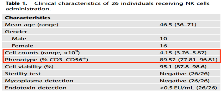 Recent studies by Chinese scholars have found that the use of NK cells for reinfusion therapy successfully killed senescent cells in mice or humans, and found that the senescent cell clearance ability of NK cells was significantly improved after combined with a dopamine-releasing peptide [ 4]. The study enrolled 26 volunteers who received NK cell infusions. The proportion and absolute number of peripheral blood NK cells and the purity of the NK cell product infused into each individual were inversely related to the age of the volunteer. The characteristics of volunteers and NK cell characteristics are shown in the table below: