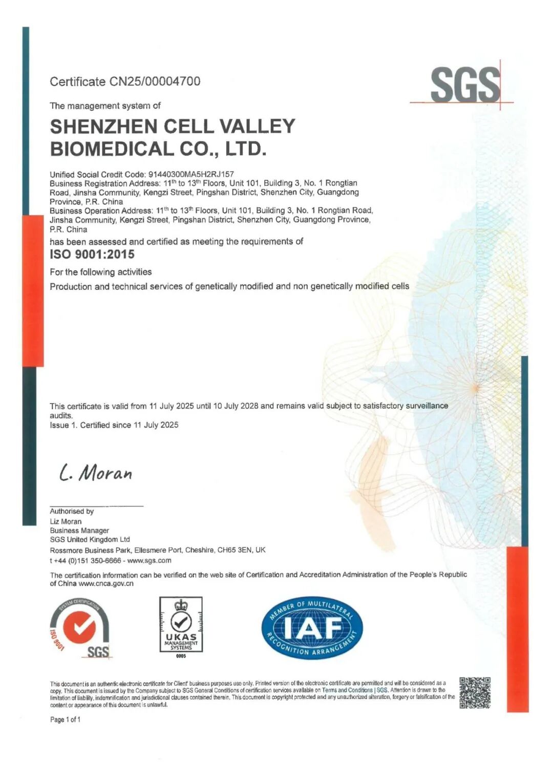 2025年7月11日,经国际权威认证组织SGS严格评审,深圳豪门国际生物医药有限公司正式取得ISO 9001:2015质量管理体系认证证书,认证范围覆盖基因修饰及非基因修饰细胞生产与技术服务。