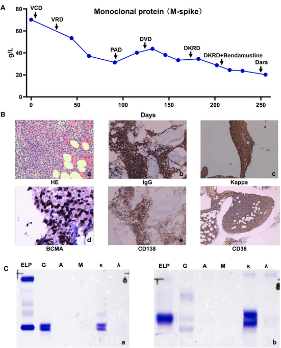 图2 输注CAR-T前患者诊断结果(A)化疗过程中M蛋白的水平。(B)输注CAR-T前的骨髓涂片。a: HE染色;b-f:免疫组化。(C) 血清和尿液中IgG和Kappa均为阳性。